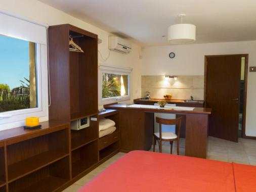 Habitación para 1 ó 2 personas. Con baño completo. Ubicada en planta baja, con ventanal al frente y salida directa al desayunador. diferencia de los Monoambiente, esta habitación no posee cocina.